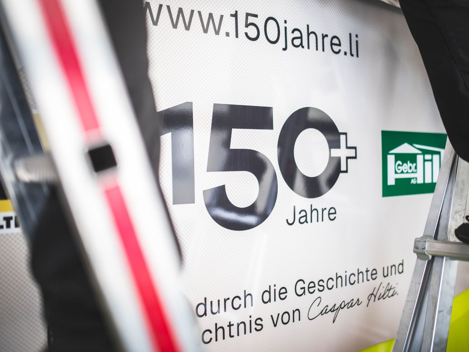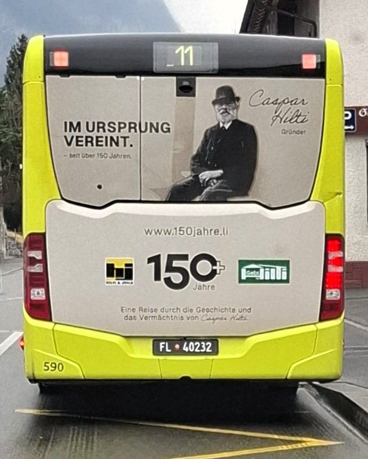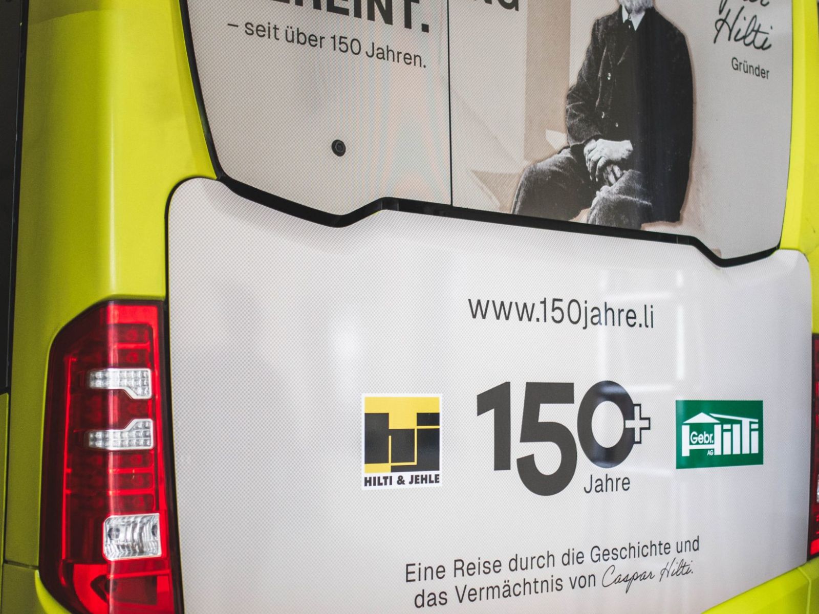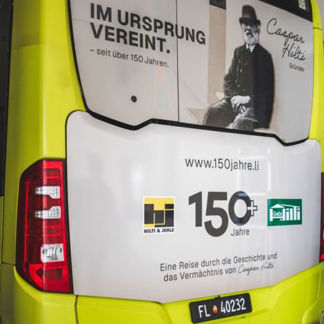 Jetz sichtbar auf unserem Jubiliäumsbus, stolz beklebt mit "150+ Jahre", dem Logo der Gebr. Hilti AG und dem Logo von Hilti & Jehle - der Firma von Caspar Hilti, unserem Gründervater und Pionier.